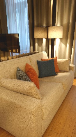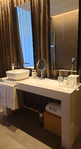 バスルームと部屋の仕切りはガラスになっていて、透けにくいシアーカーテンと部分的にミラーが仕切りになっていました。壁を作らず部屋を広くするためか、ガラスの透明感で更に広く見せるためかと思いますが、不透明にできないのはやはり使い辛いですね。