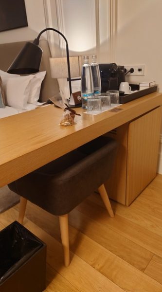 旅先でもPC作業は必要になるので、必ずテーブルやデスクのある部屋を選ぶようにしています。また、入室時は、PCや携帯電話、日中の出先では必需品となるモバイルバッテリーの充電が必要になるので、コンセントの変換プラグは1人1つか2つ持参し、常にコンセントに刺さっている状態でした。1人2つは必要かもしれませんね。